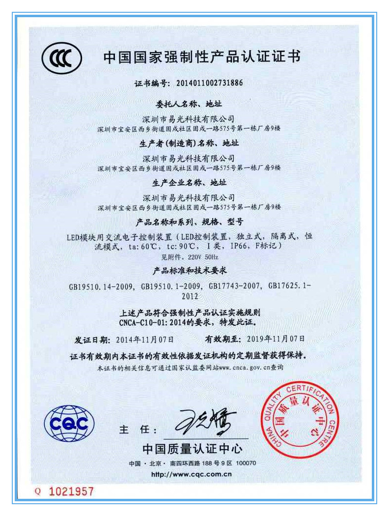 易光科技公司的LED電源,共13個系列,260個型號,自2011年起擁有CQC認證證書。包括: